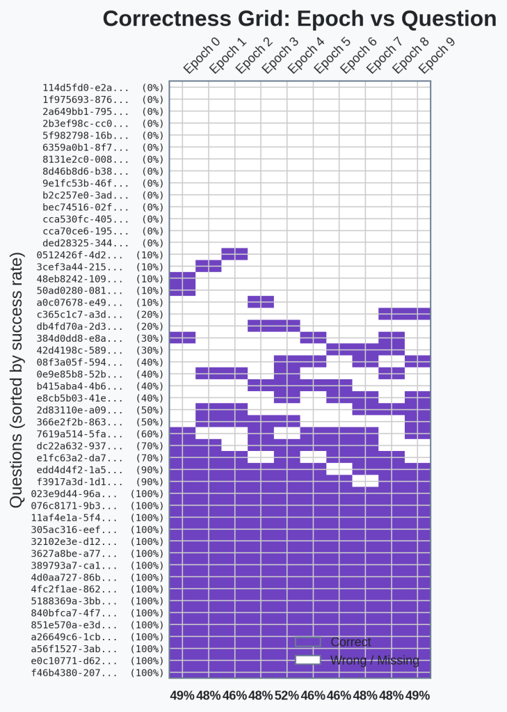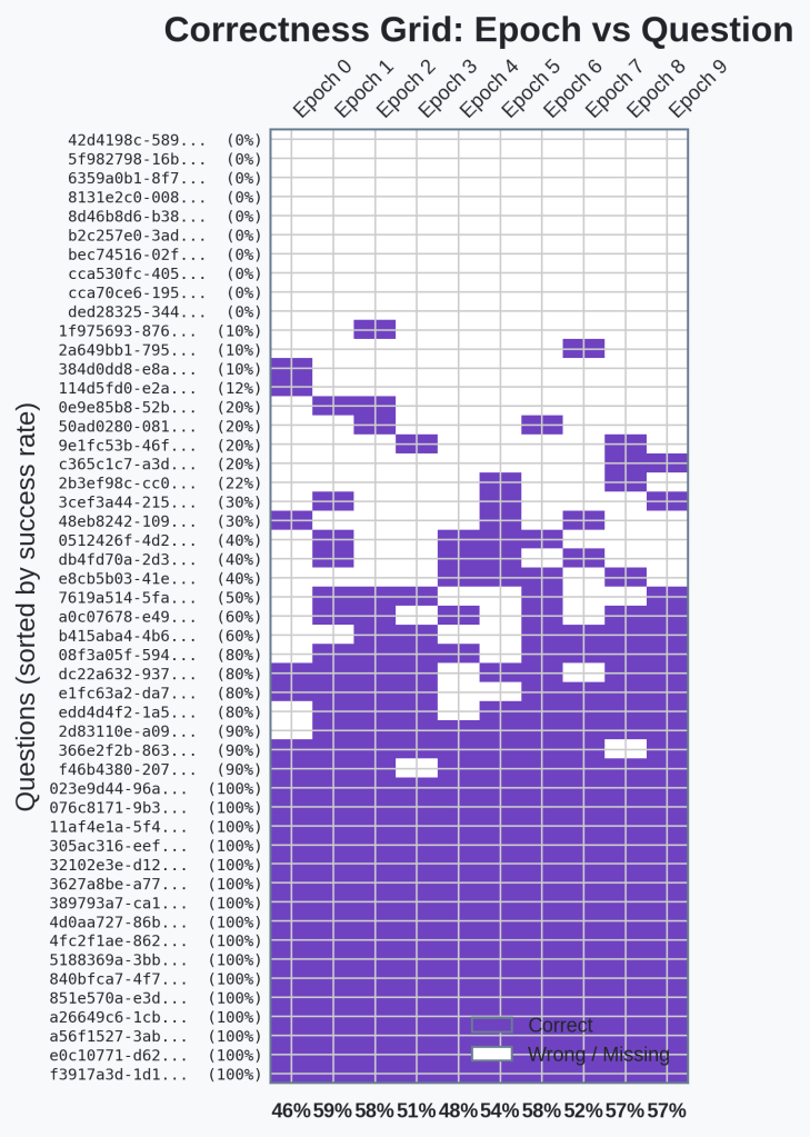 The first thing I want to check is whether there is a clear indication of skills changing which questions we get right. So let’s look at the same block chart to see which questions we’re getting right and wrong across epochs.