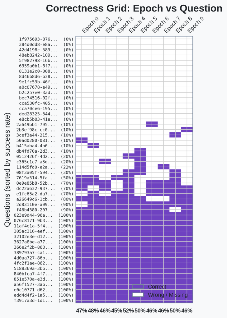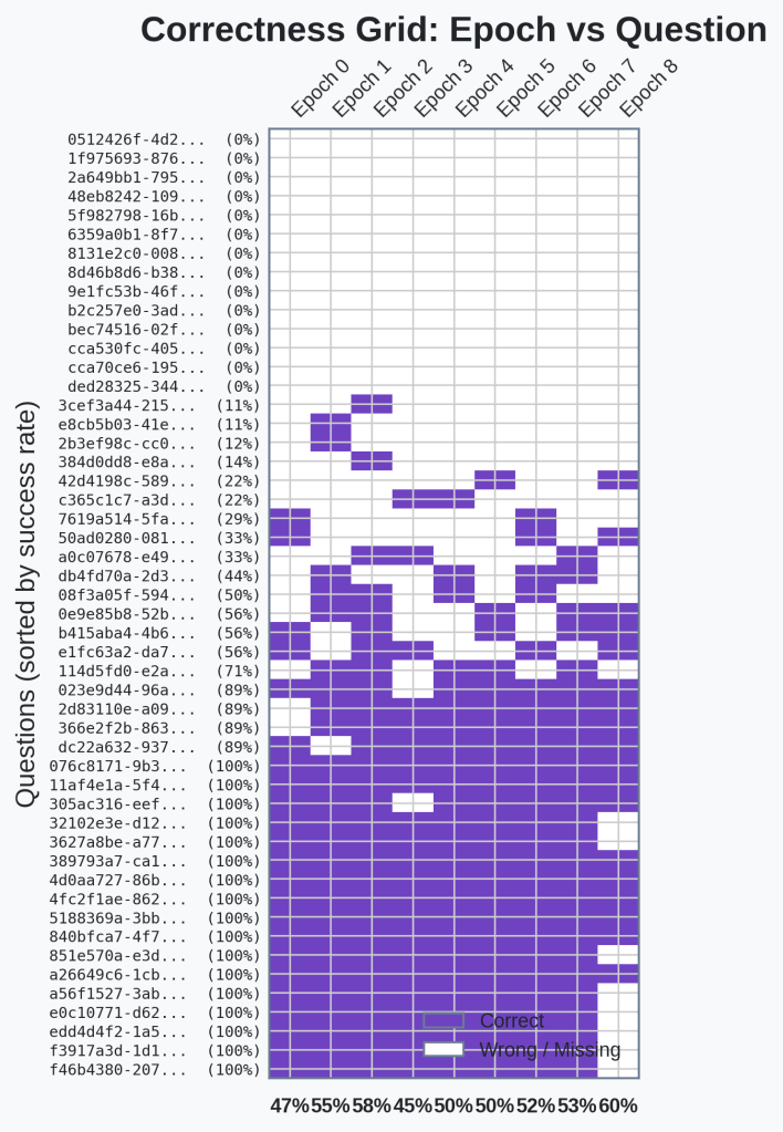 We can see that epoch 8 has a bunch of incorrect answers. This is due to the token exhaustion. But, there are no clear signs here that the skills are actually providing some lift for specific questions. Time to dig a little deeper and see what is actually working.