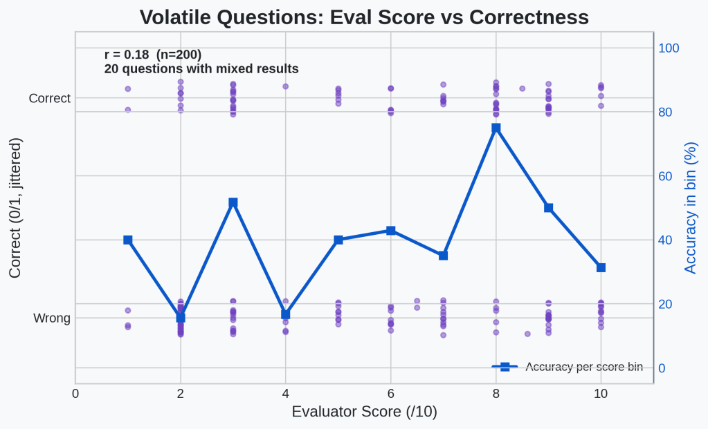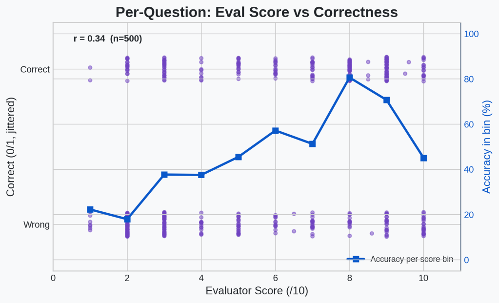 Okay. Another good sanity check is to see if the eval results actually correlate at all with the actual benchmark results. I created a scatter plot that maps benchmark accuracy to evaluator score on a per-question basis across all epochs (the purple dots). I’ve also included an accuracy rate per eval score bin (the blue line).