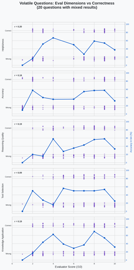 Okay, there doesn’t seem to be any pattern here. There are questions we get consistently wrong, questions we get consistently right, and then a suite of questions that are right on the edge of the agent’s capabilities.